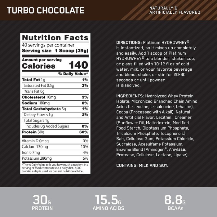 Platinum Hydrowhey Protein Powder is the most advanced whey protein we've ever developed. In a word: Excellence. By hydrolyzing whey protein isolates to break larger proteins down into smaller pieces, these ultra-pure whey isolates are able to get into your system rapidly, enabling your muscles to start recovering from heavy training. We've dialed up this ultra-pure and rapidly-digesting formula with added micronized Branched Chain Amino Acids (BCAAs).